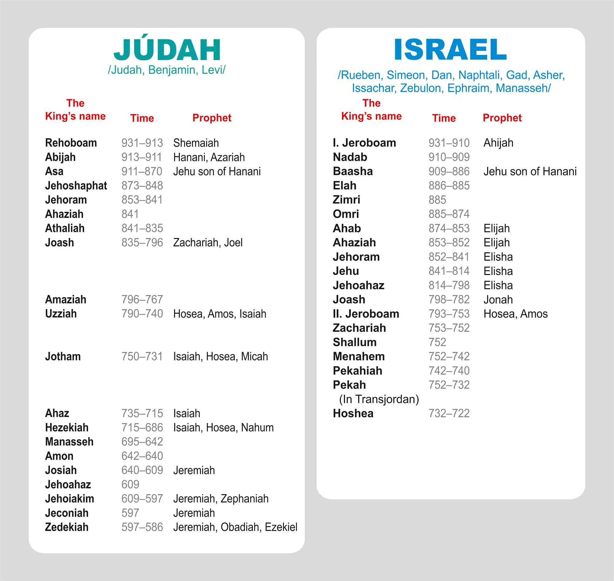– Israel and Judah constantly fought with each other. Israel turned away from the Torah almost immediately, their idolatry was followed by drastic moral destruction. At the time of Ahab and Jezebel the country reaches its nadir. Elijah the prophet, his disciple Elisha, and later many prophets communicated the Lord’s judgement: if they did not repent, the consequence and curse of the disobedience to the Torah would come into effect, the people would lose their homes and would be sent to diaspora.
